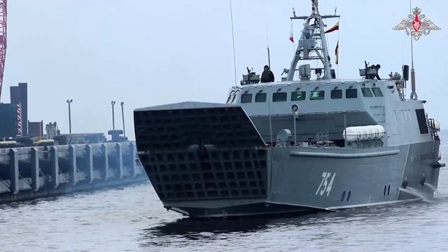 В ходе совместного стратегического учения «Запад-2025» десантный катер «Лейтенант Римский-Корсаков» под прикрытием морской авиации и катеров Балтийского флота высадил морской десант в порт условного противника.
